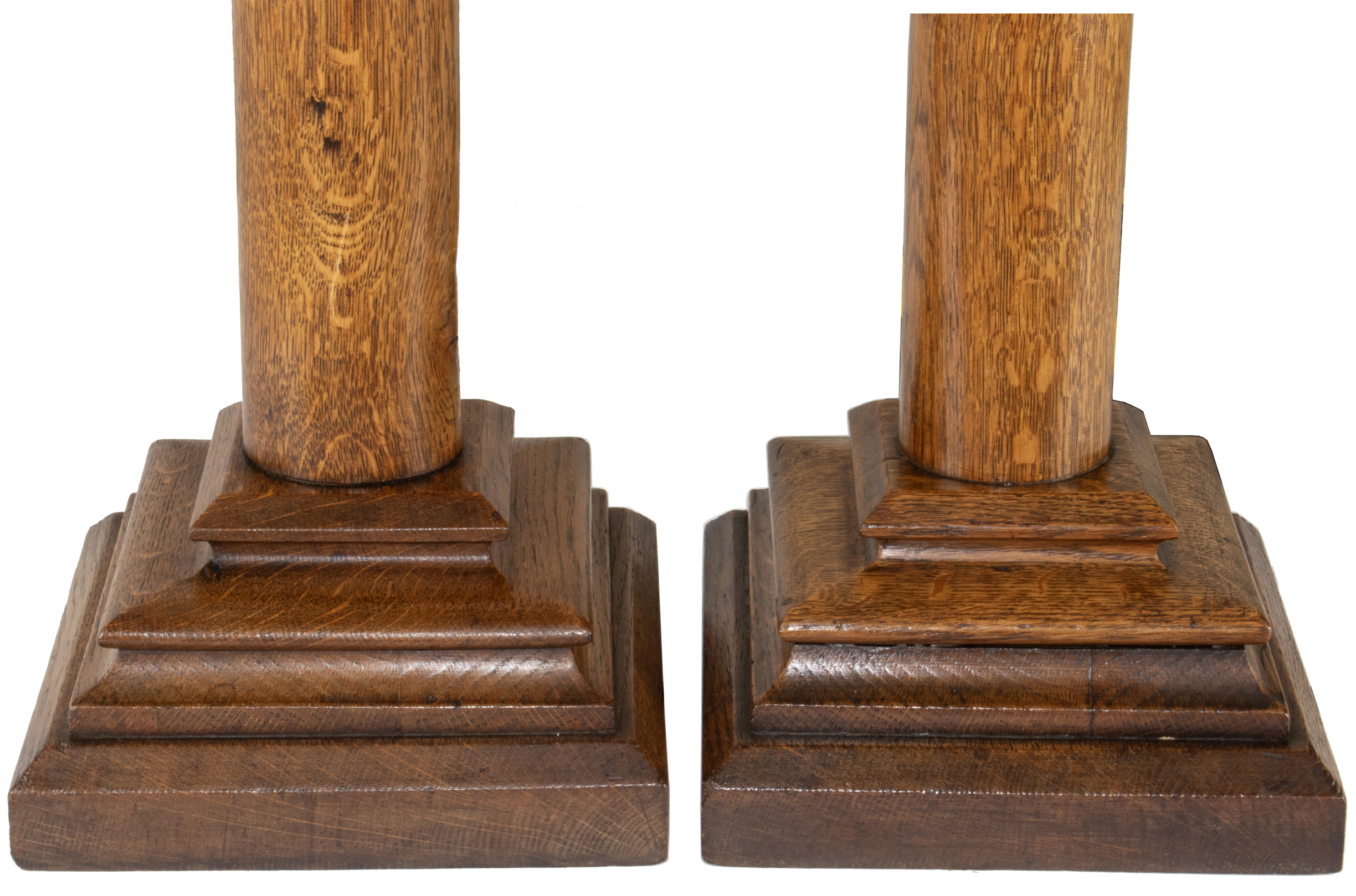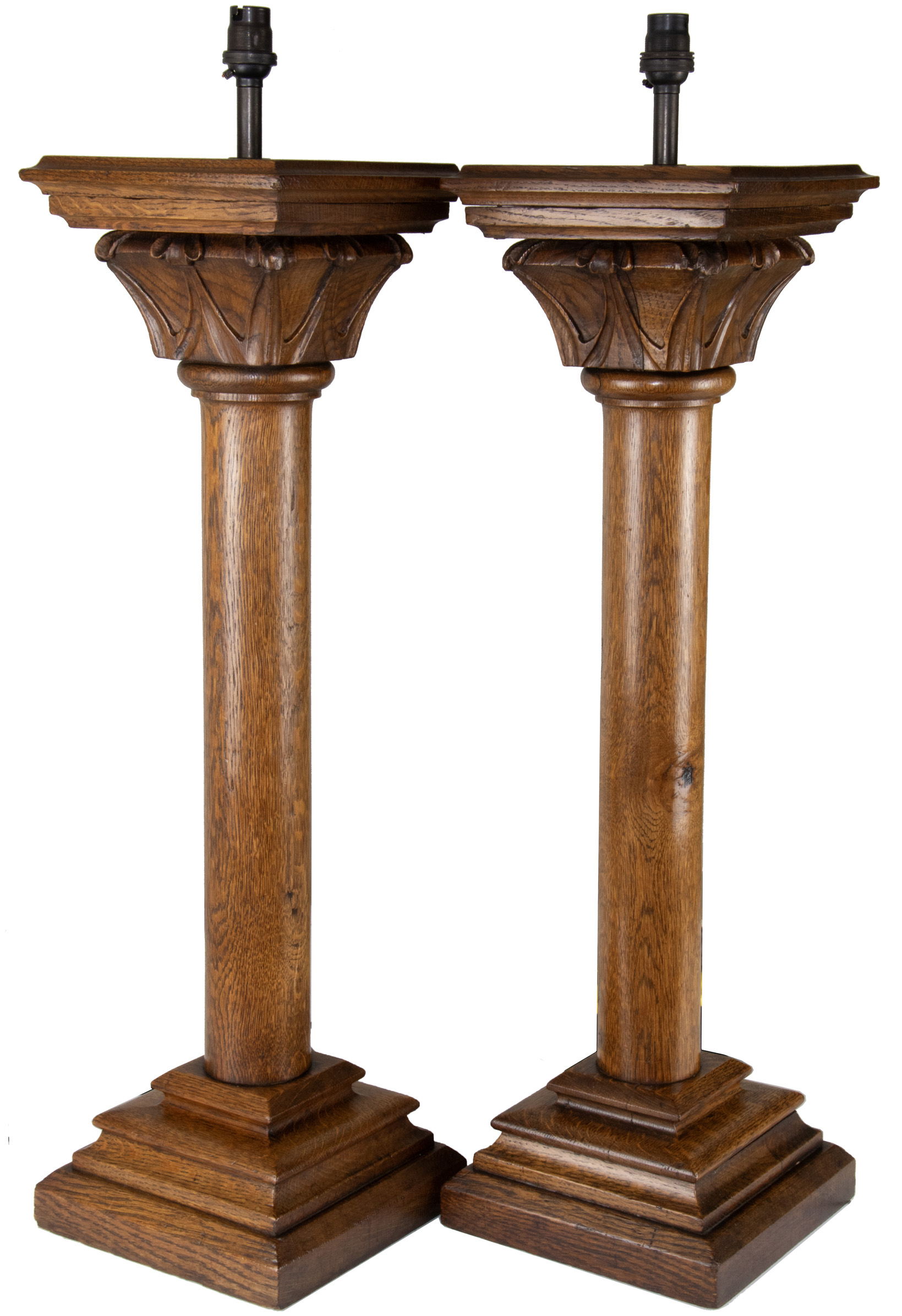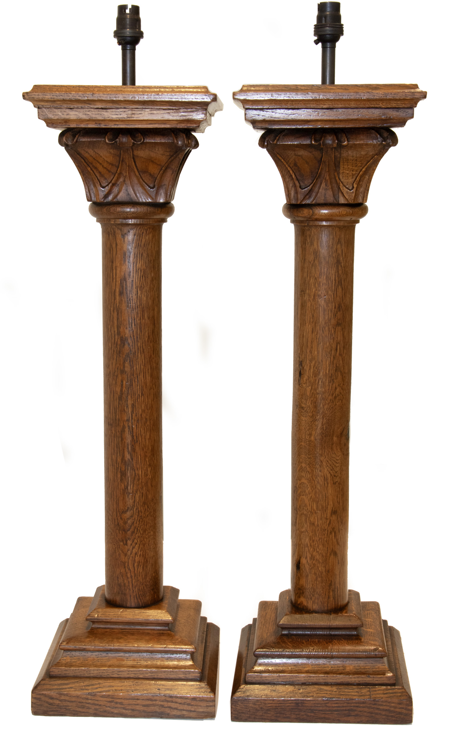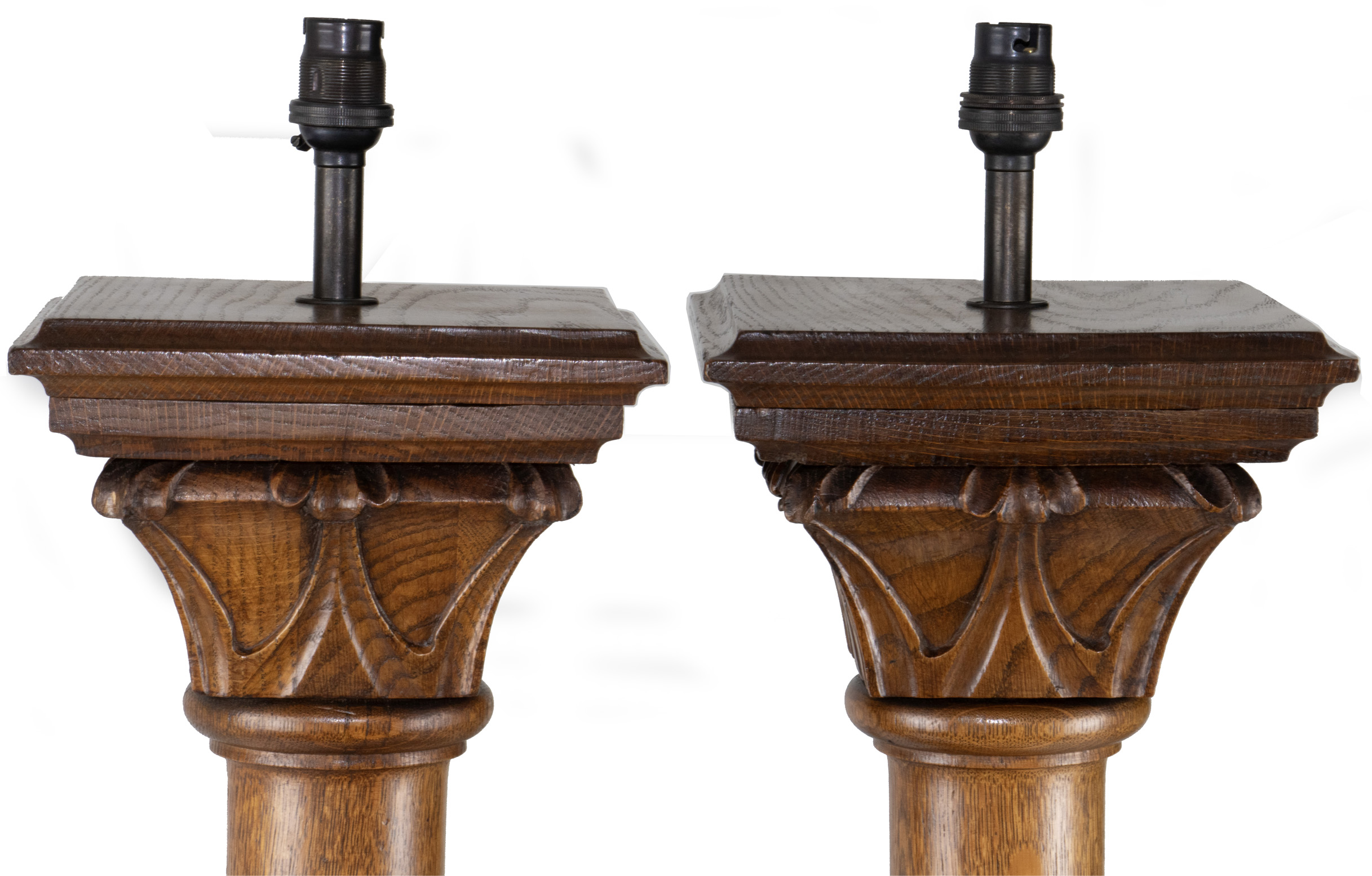 An impressive bespoke pair of turned and carved oak table lamps, with period Arts & Crafts designs raised on stepped bases.
