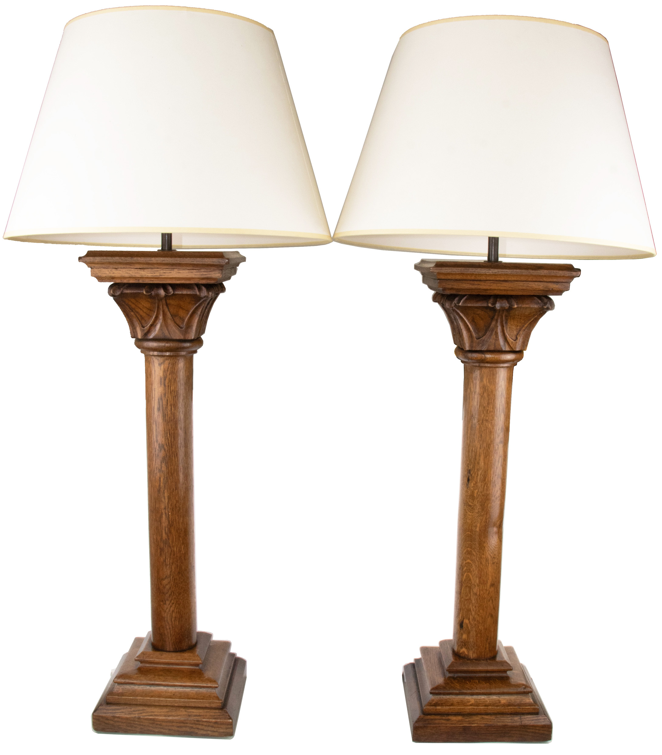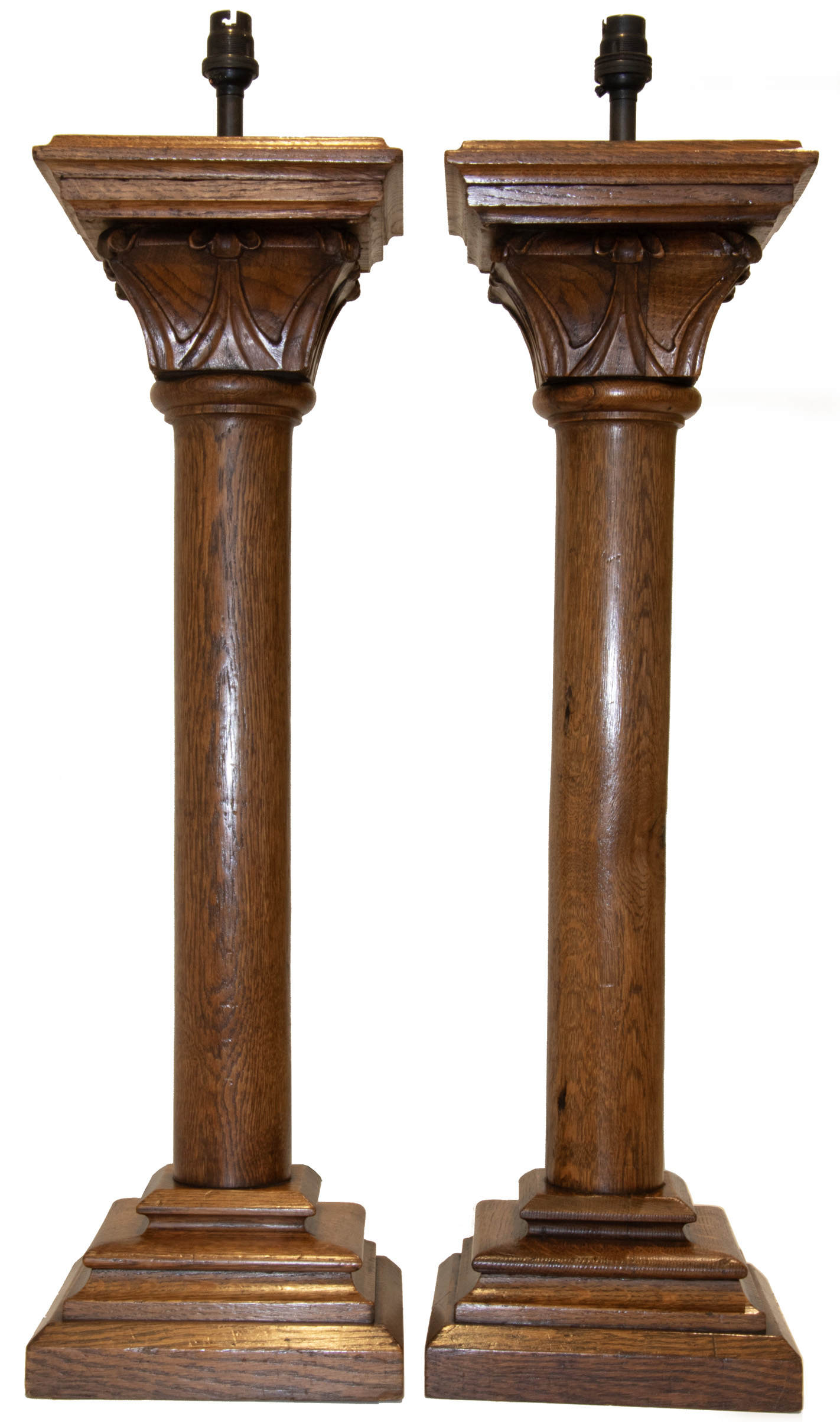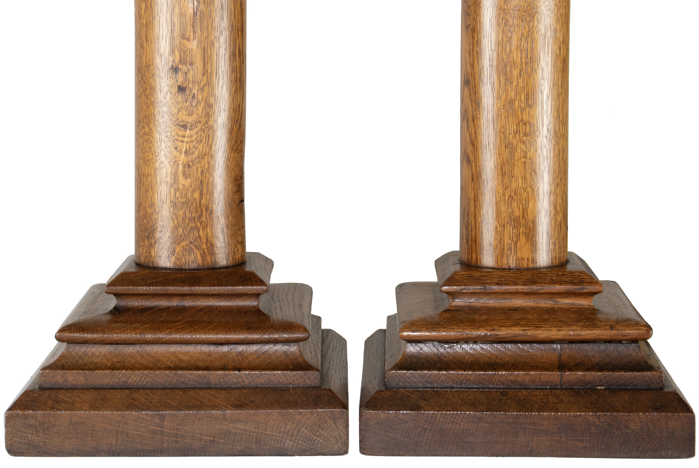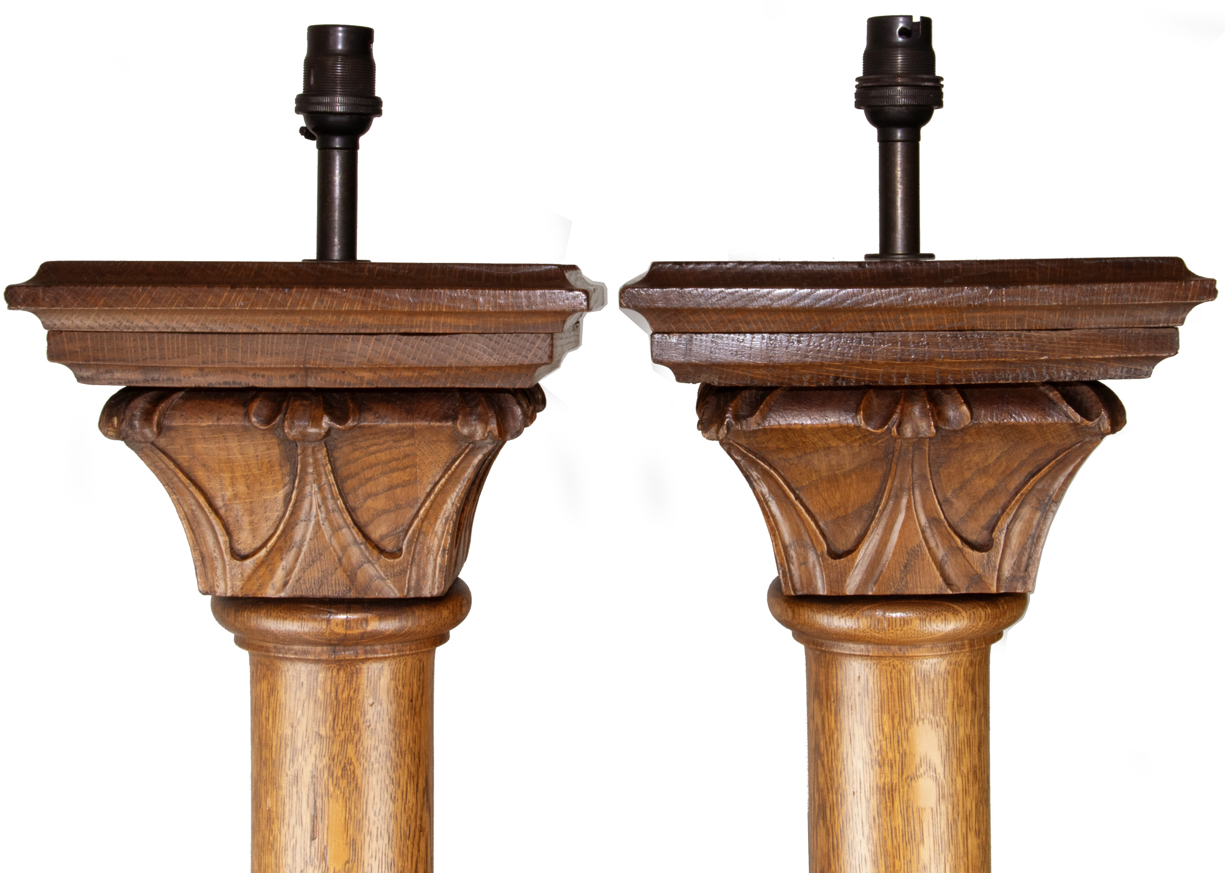An impressive bespoke pair of turned and carved oak table lamps, with period Arts & Crafts designs raised on stepped bases.