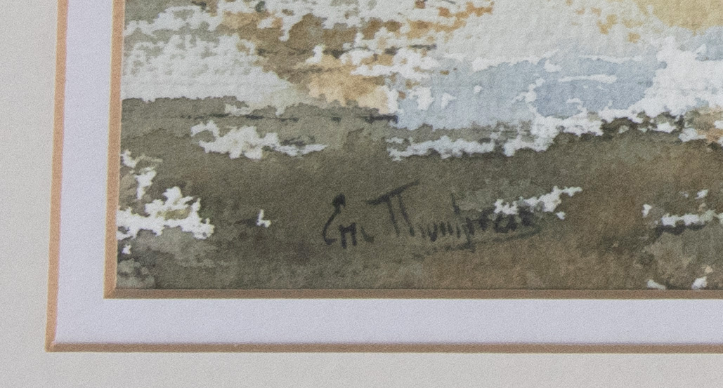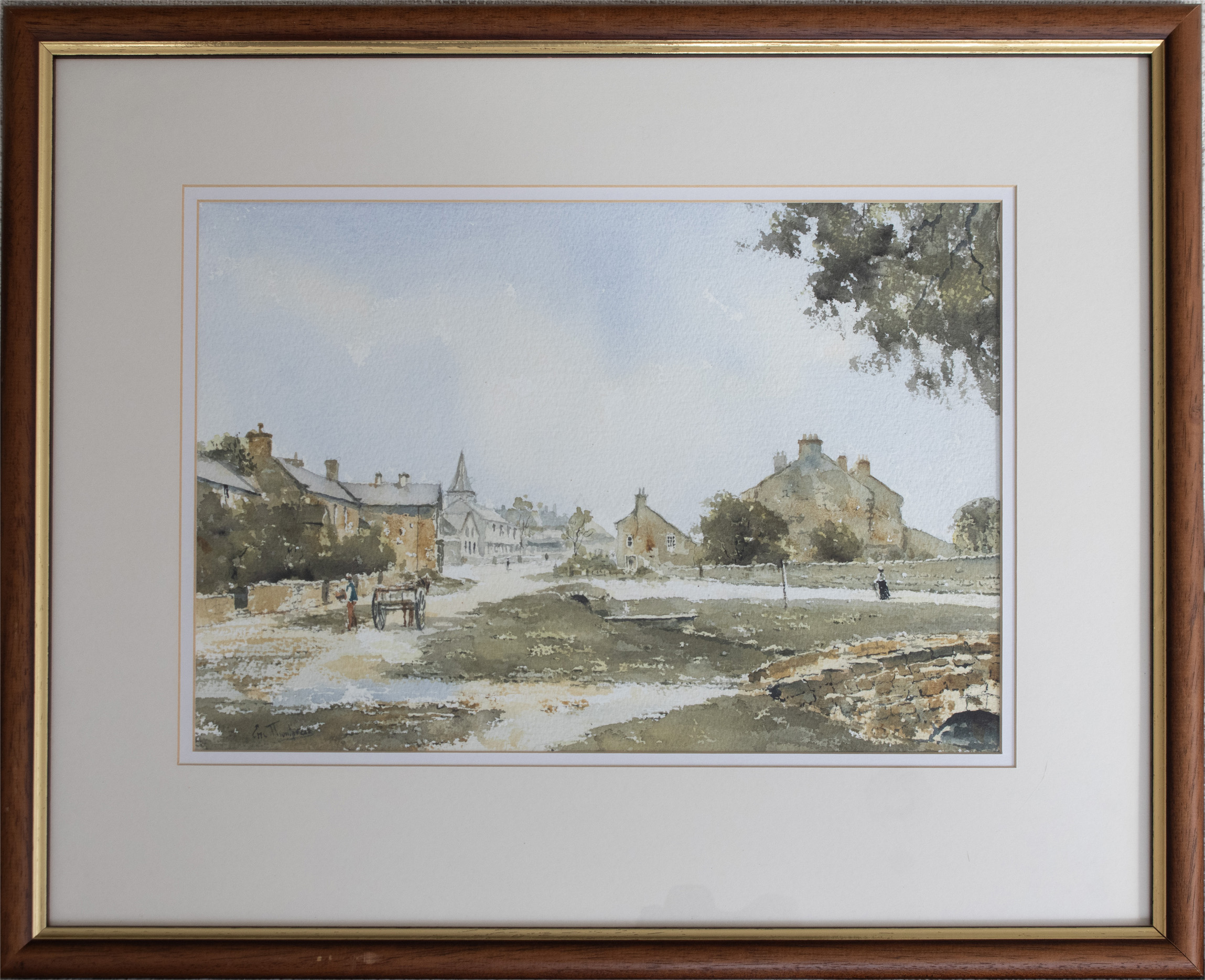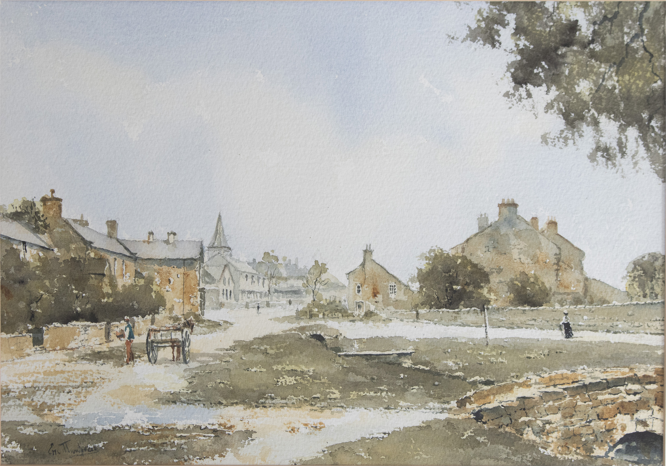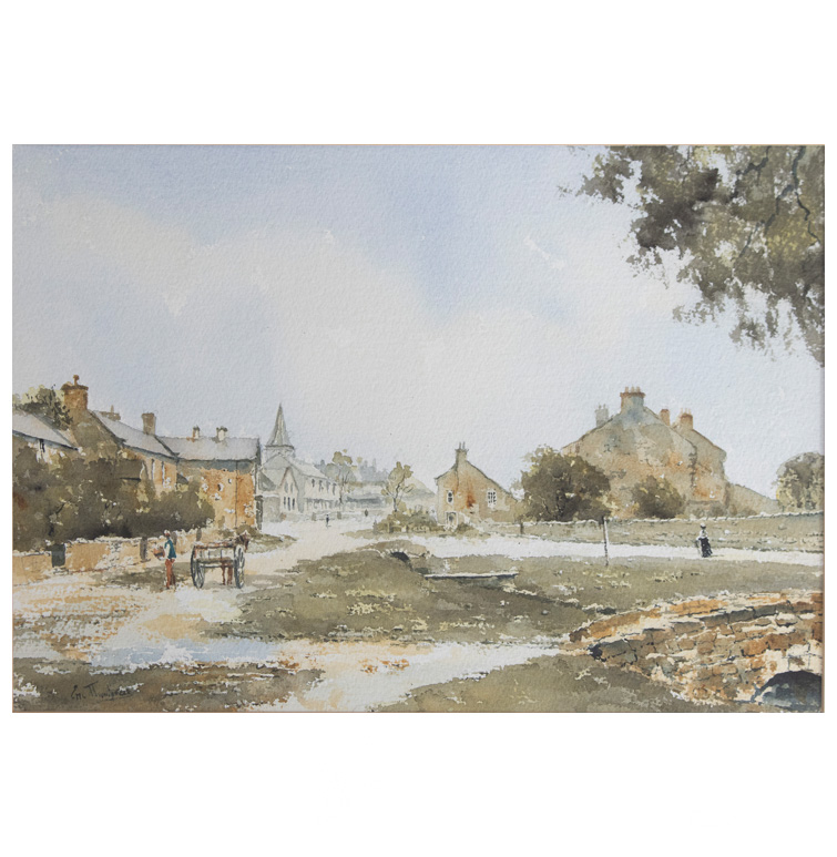 An Eric Thompson signed Watercolour of Cotherstone, looking towards the green, the Moor road and St Cuthbert’s church in the distance.