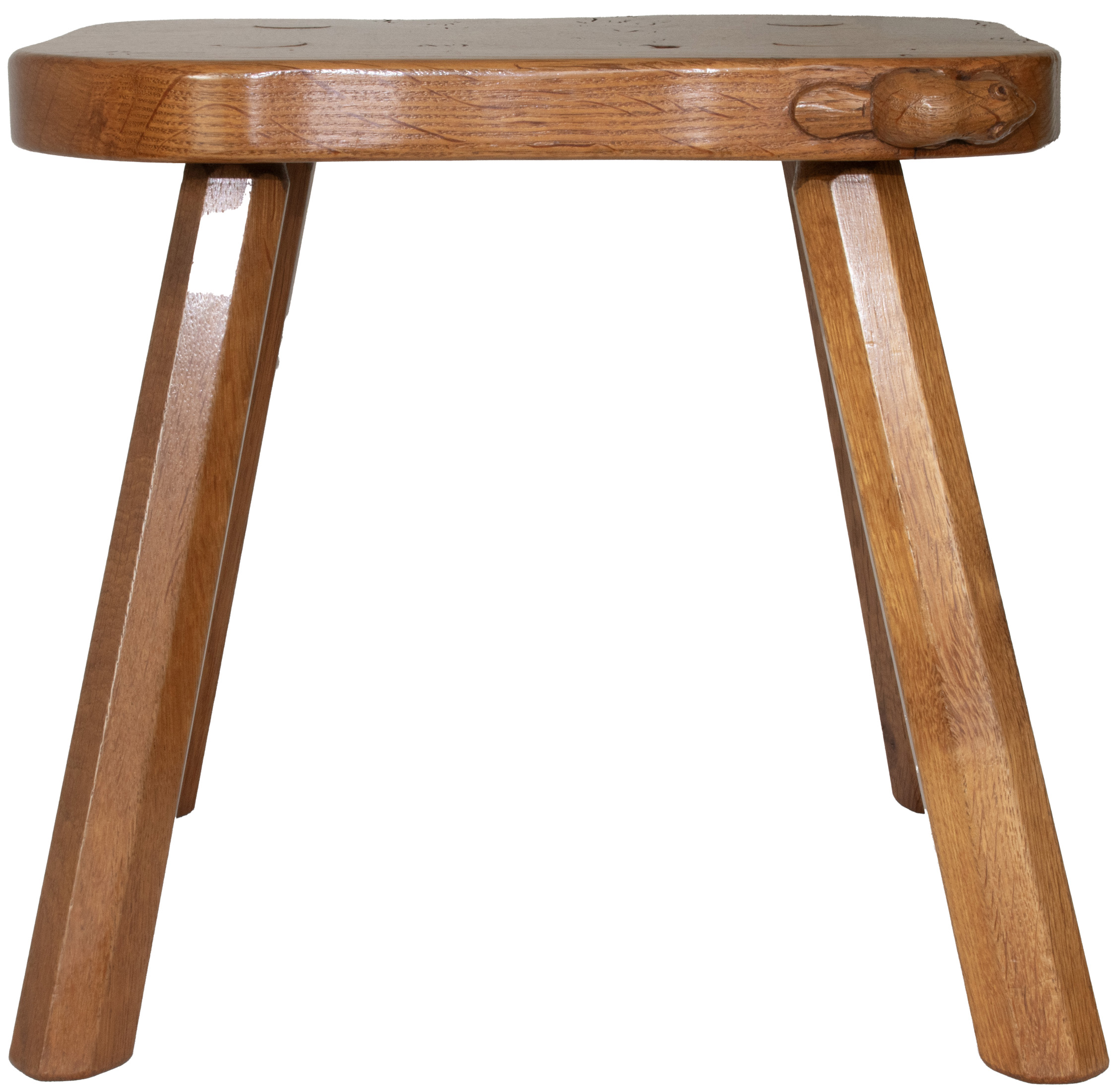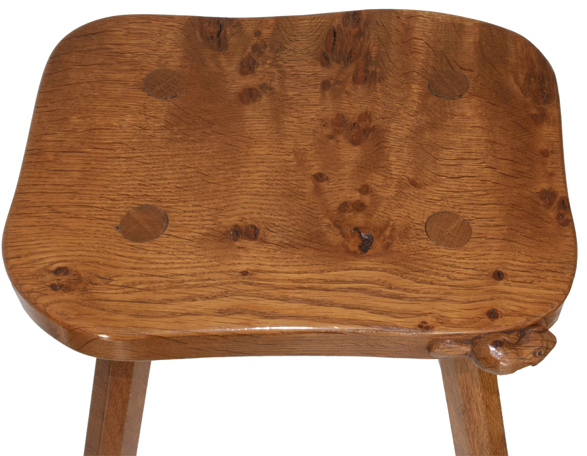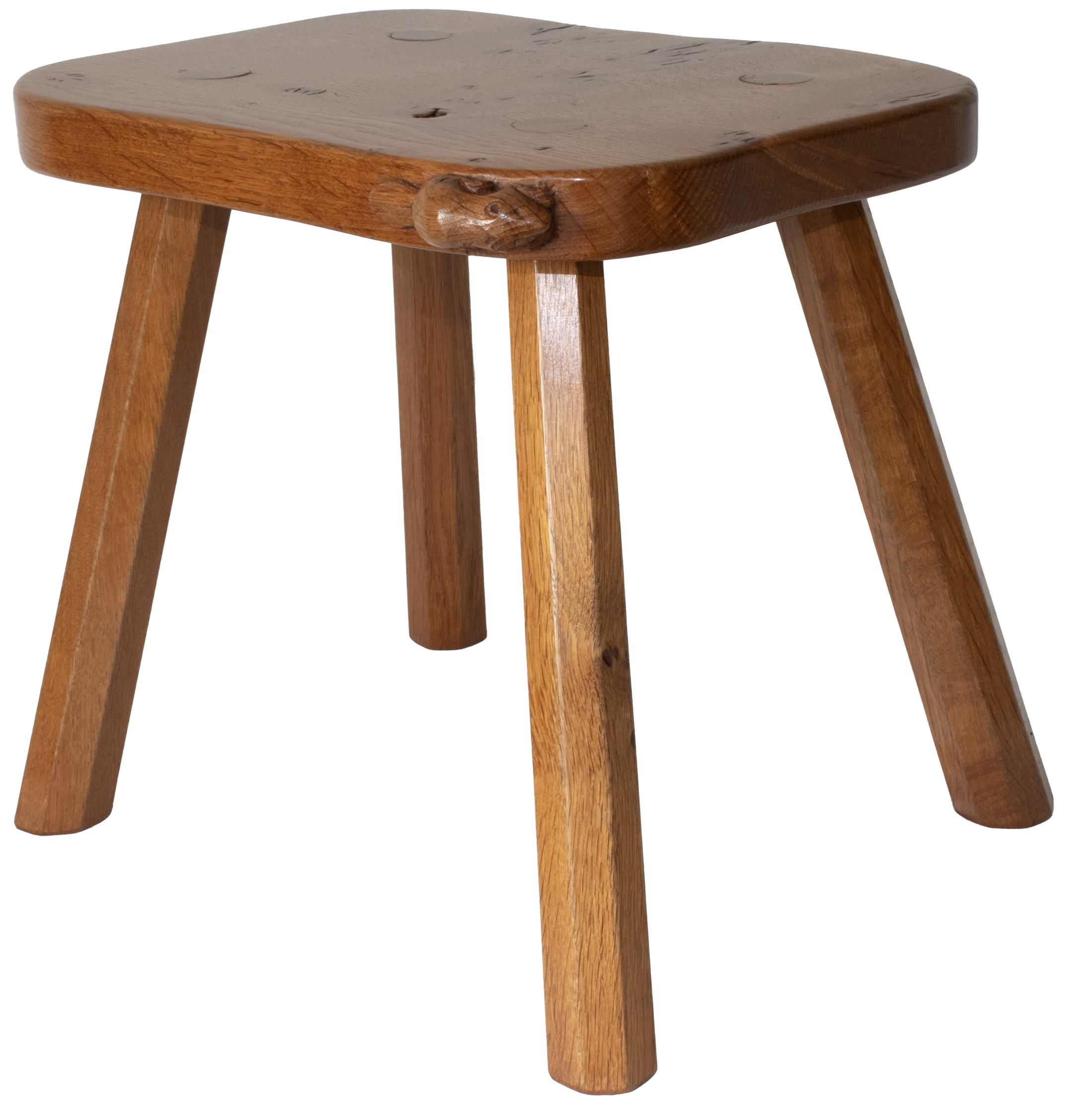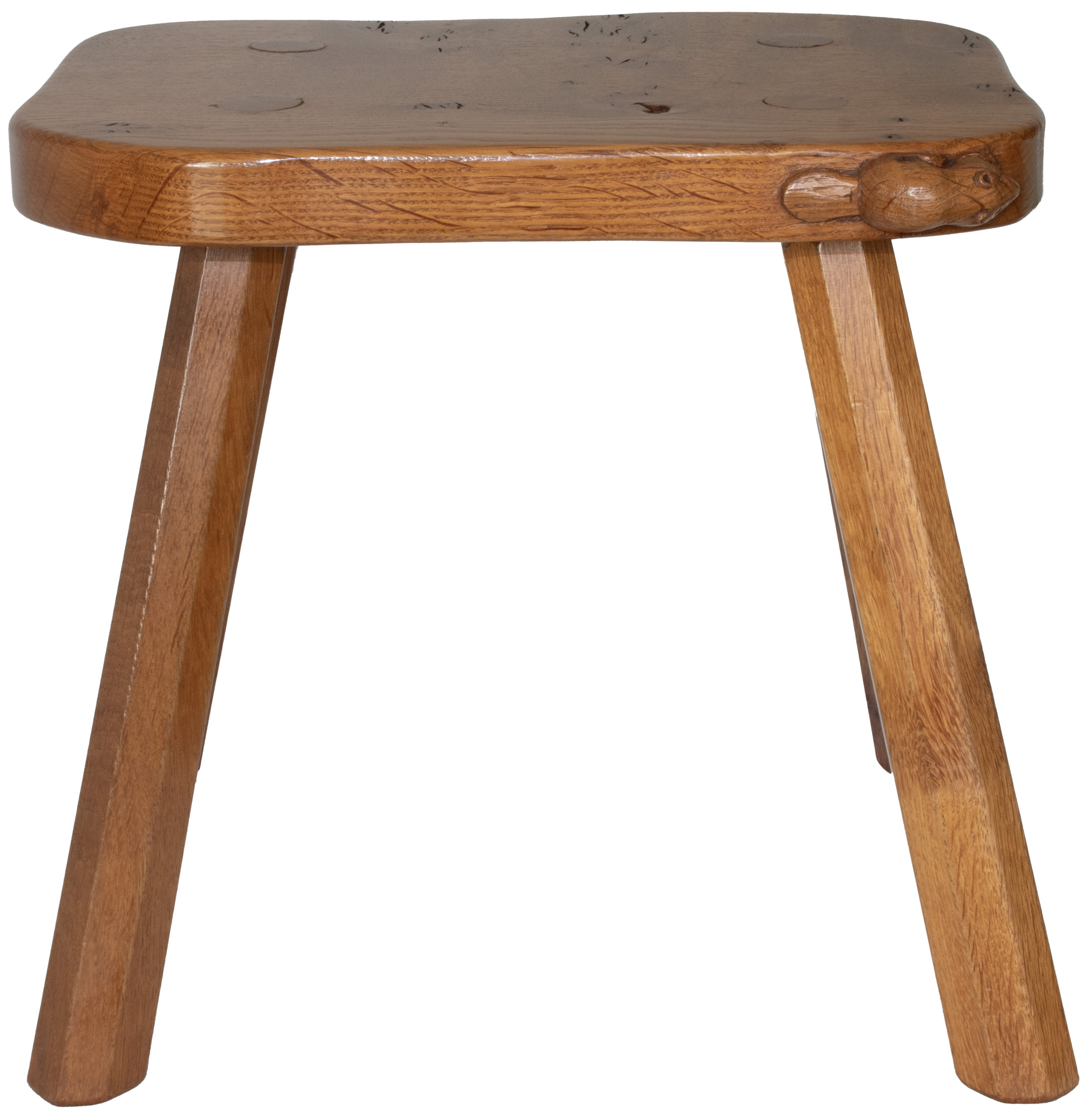A Colin Almack, Beaverman 4 legged Stool with signature Beaver carved in high relief to the edge of the seat