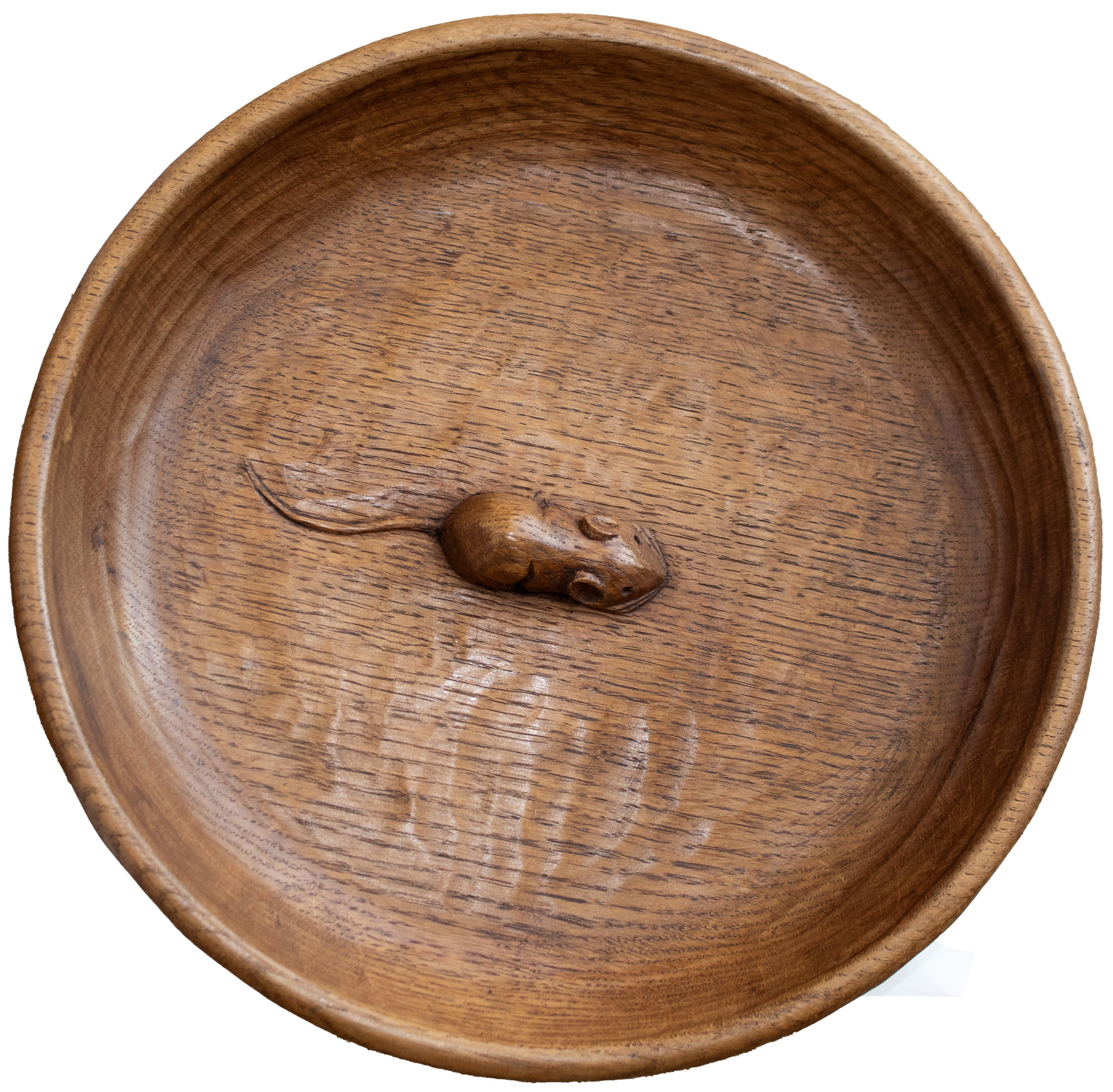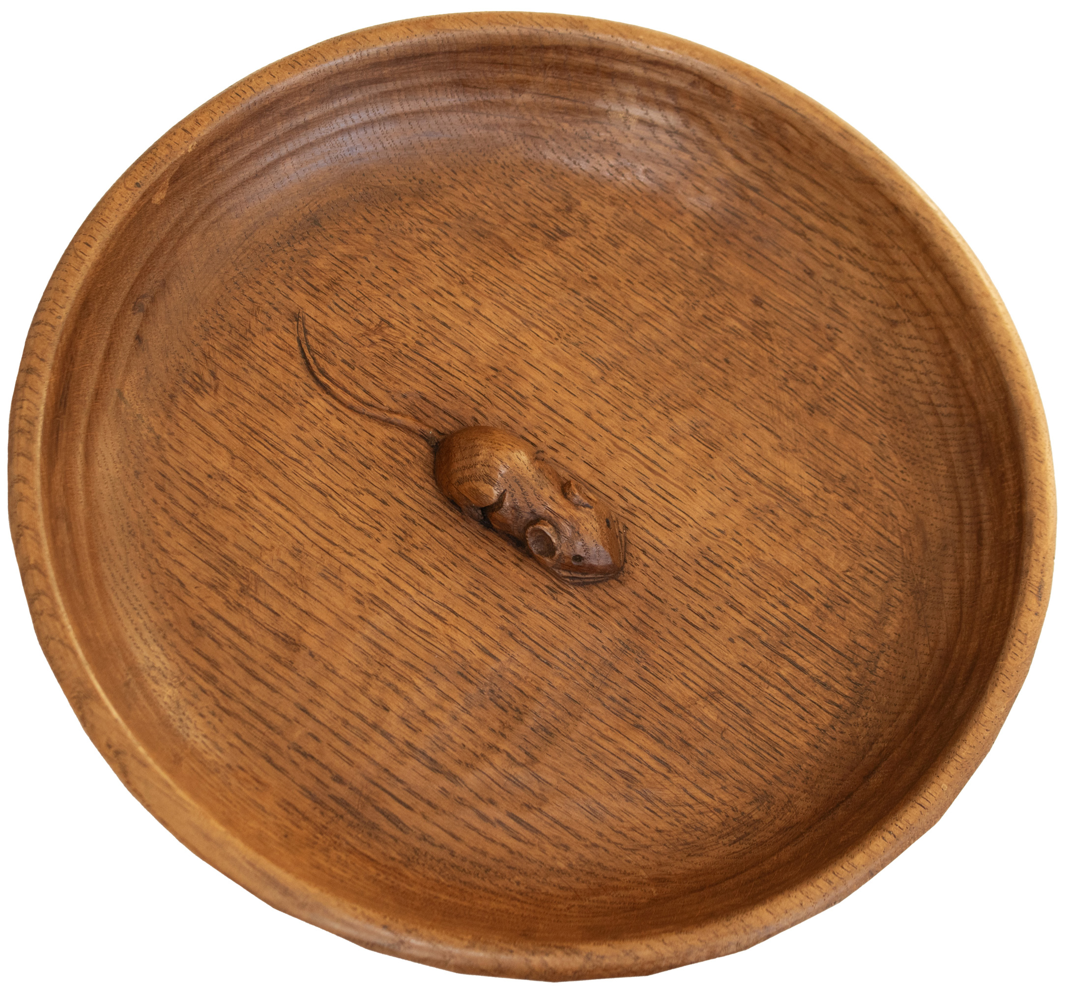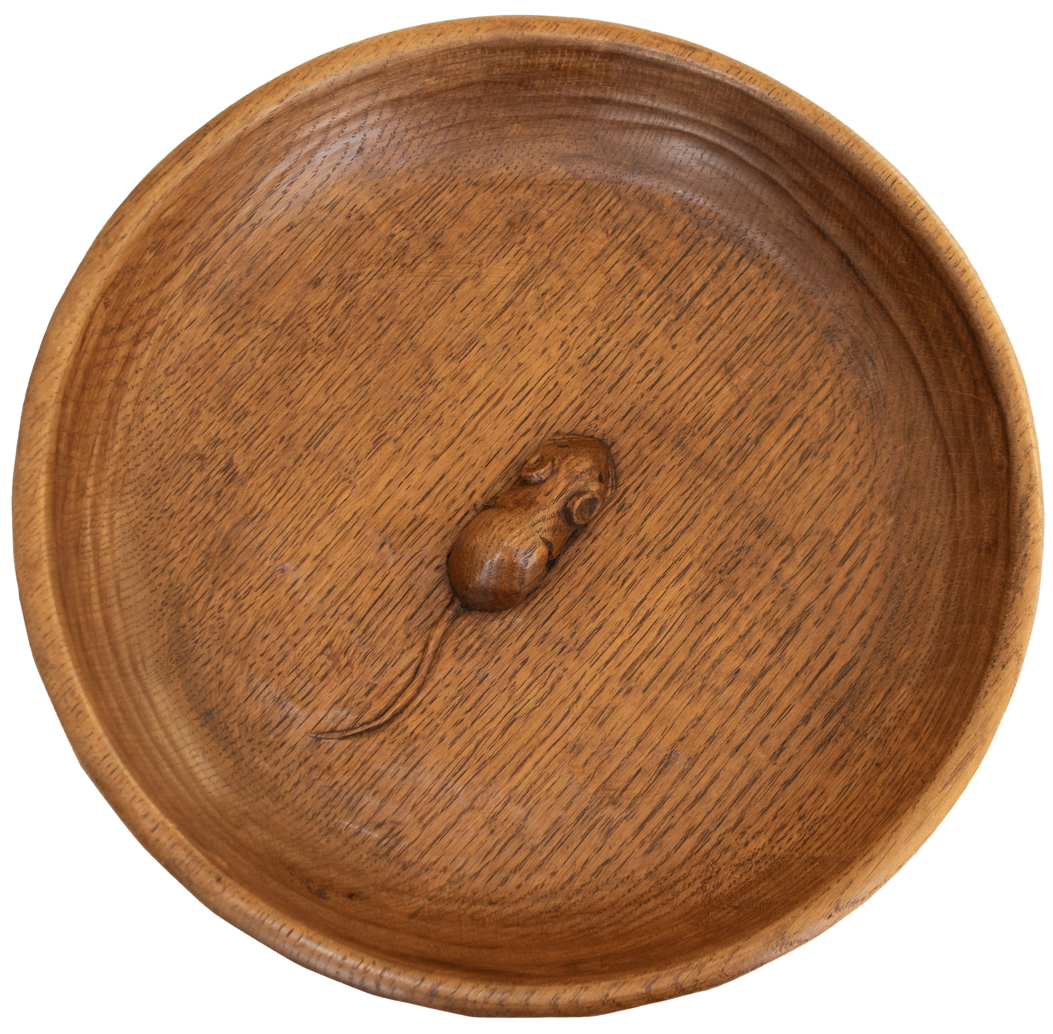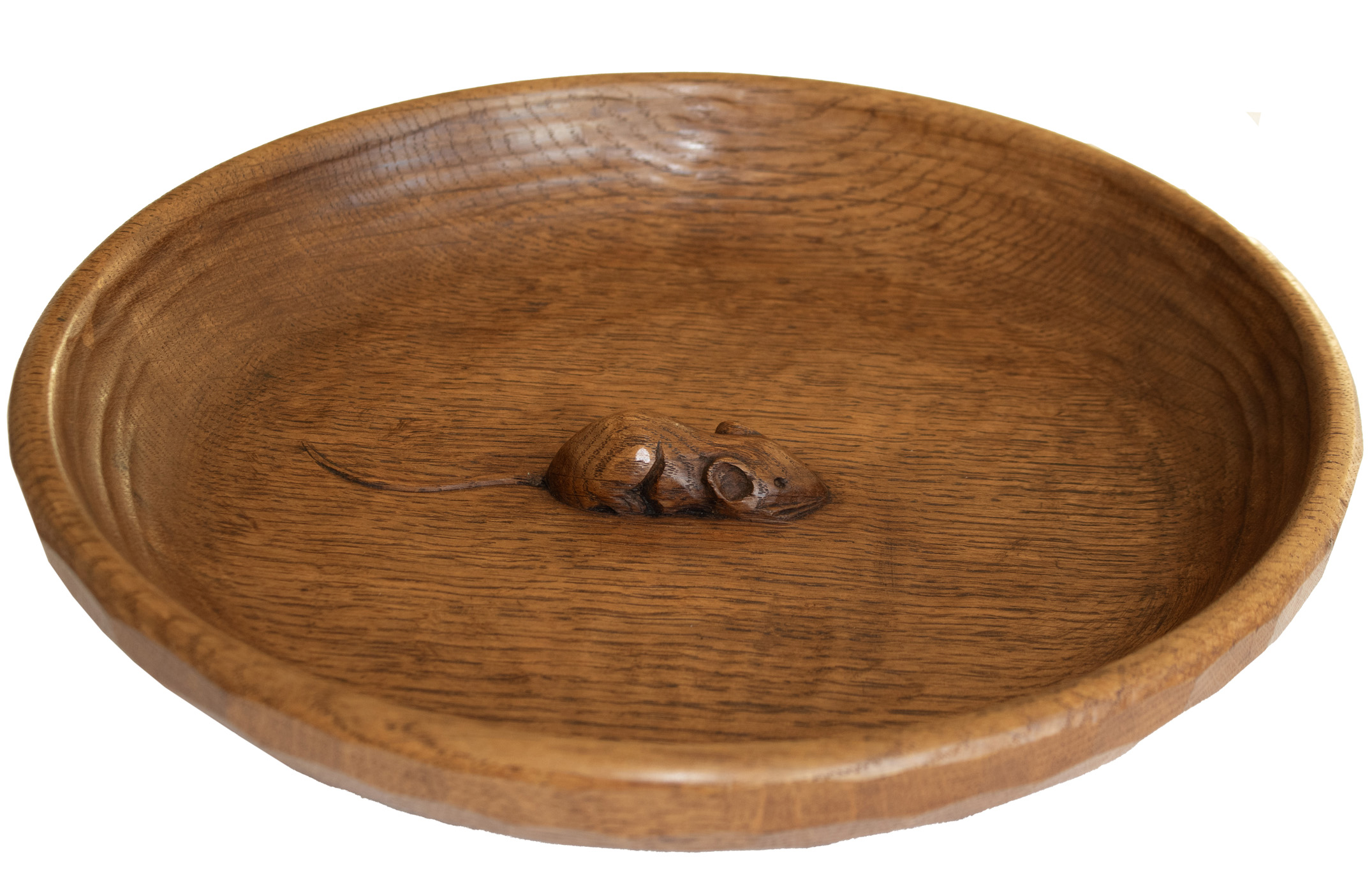A lovely modern Robert Mouseman Thompson Oak Fruit Bowl with a carved mouse signature in high relief to the centre